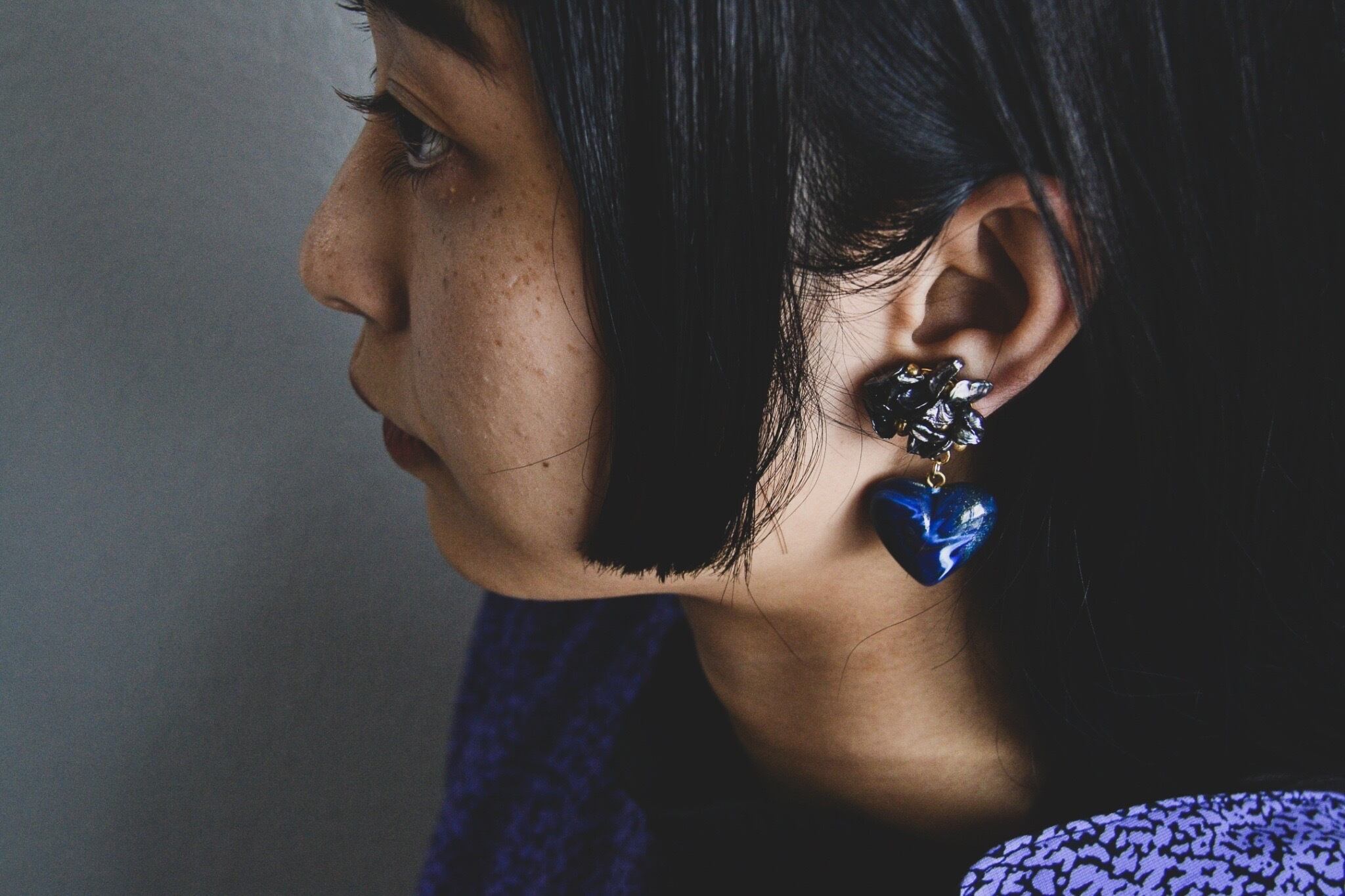 素材:淡水パールブルーブラック・ヴィンテージアクリルチャーム・真鍮製イヤリング金具